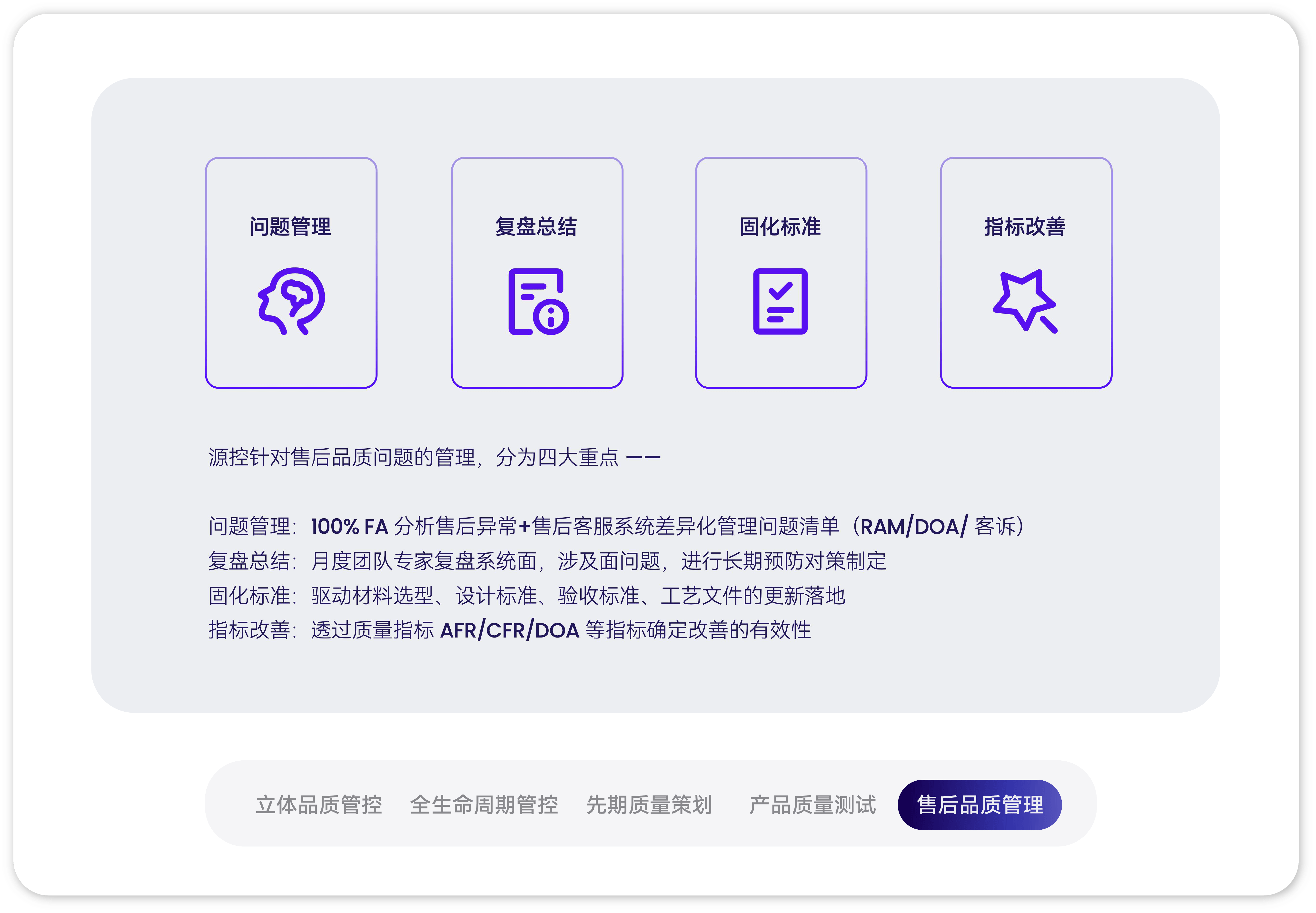 打造专业化 OQC(出厂质量检验)与 OBA(开箱检验)能力,对即将出厂的产品进行全面检测;强化检验与测试能力,配备专业设备与技术人员,确保产品各项指标达标;完善 NPI(新产品导入)流程体系,保障新产品顺利量产且质量稳定。 - 售后管理:分析沉淀,反哺设计