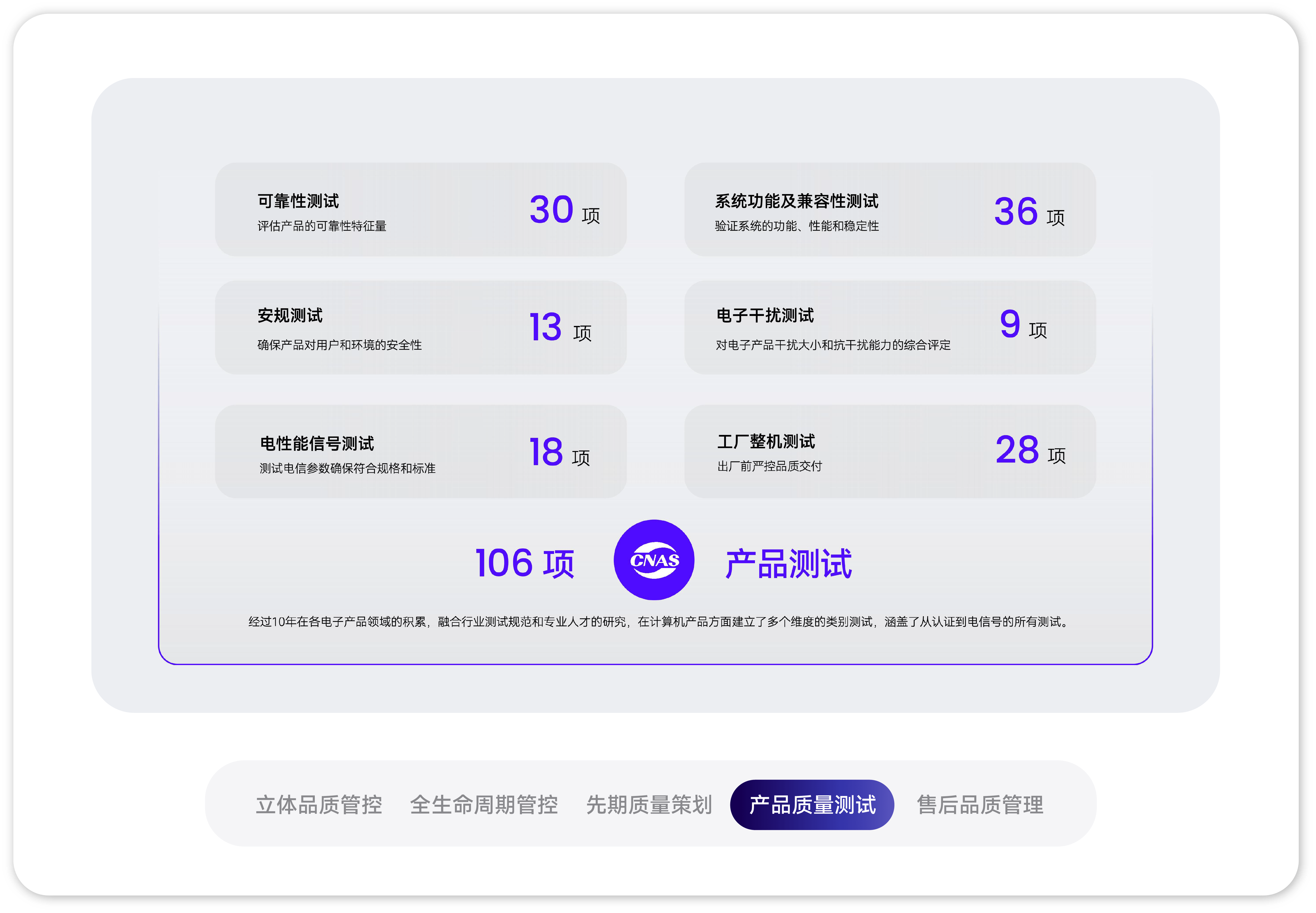 为验证产品质量是否达标,品质领航员设计了涵盖 6 大类别、共 106 项的产品测试体系,从认证到电信号,实现全方面质量核验。