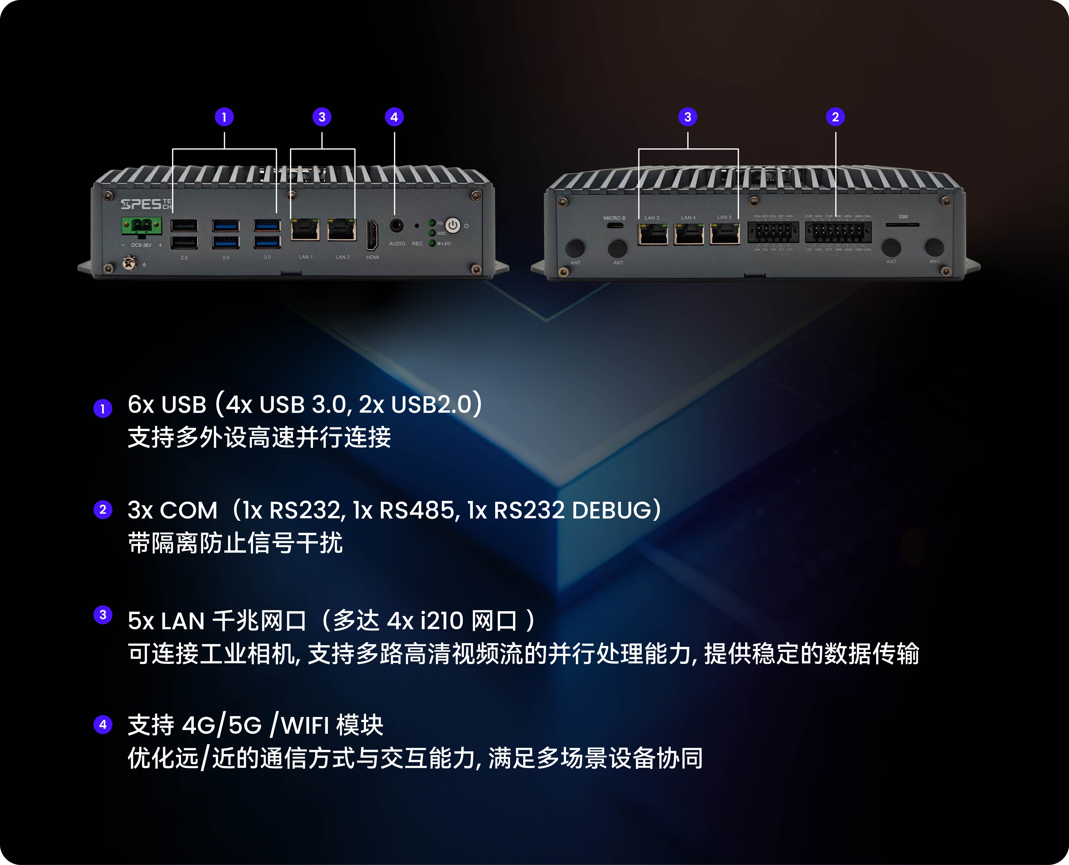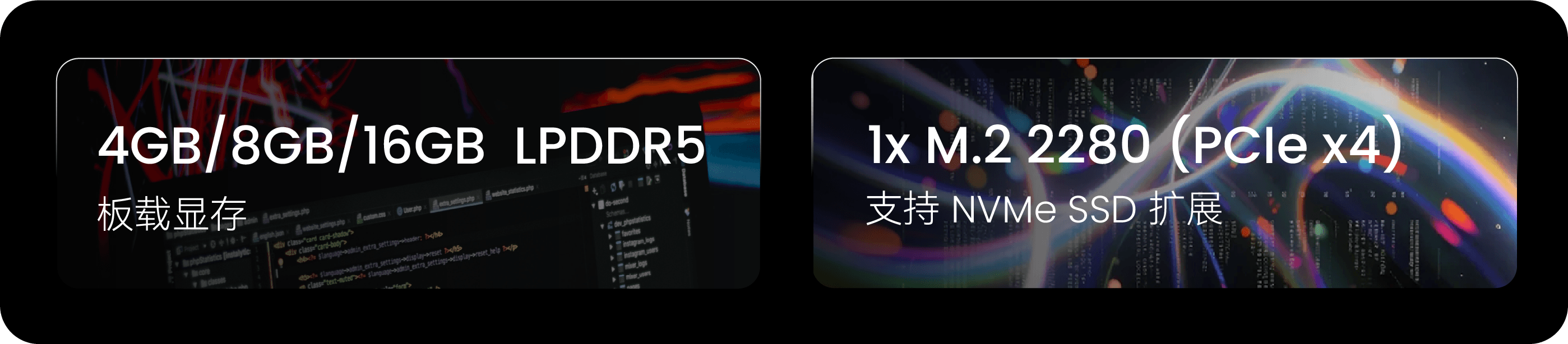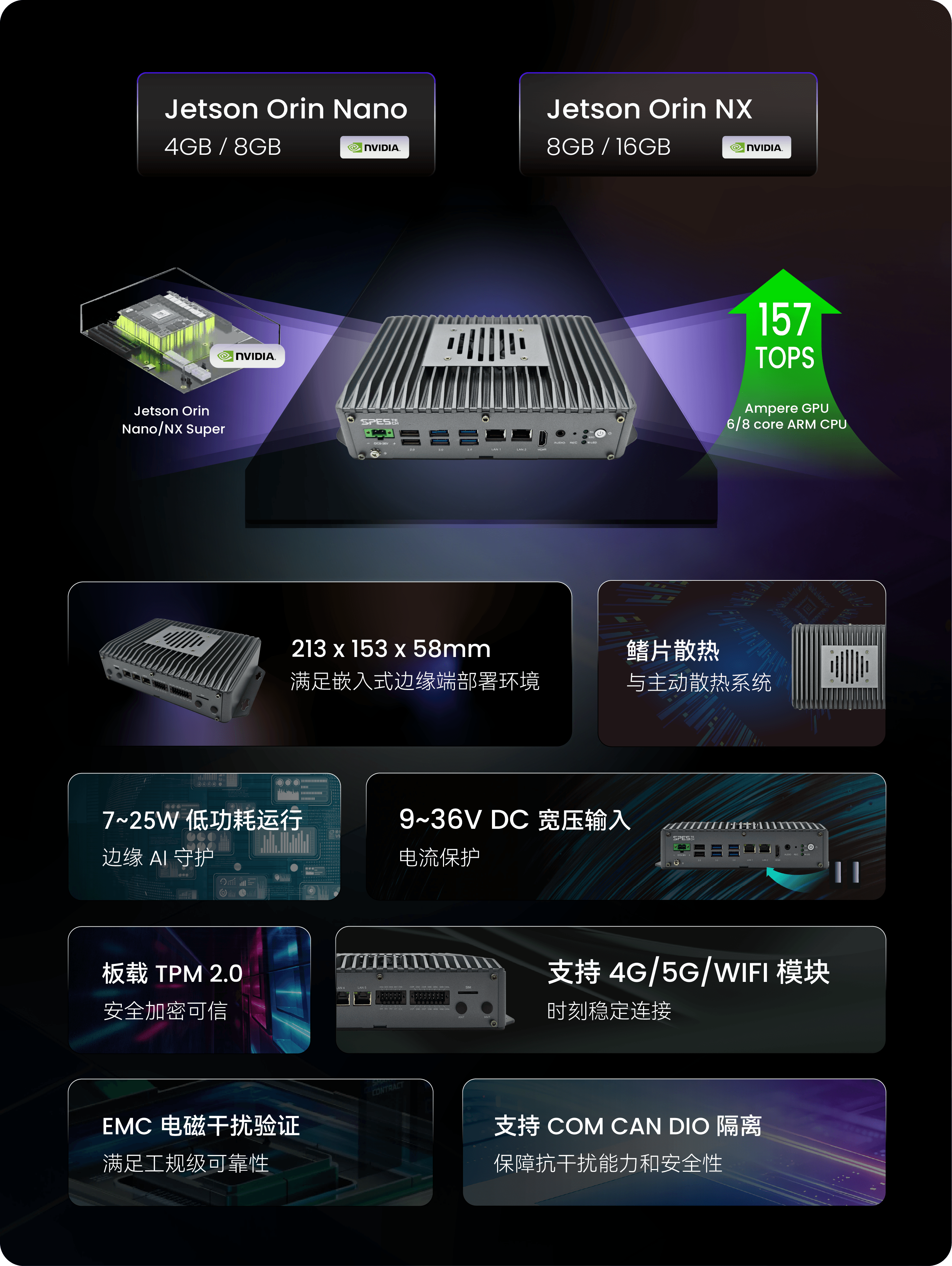 灵活存储配置:支持板载 4GB/8GB/16GB LPDDR5 显存,同时 1x M.2 2280 (PCIe x4), 支持 NVMe SSD 扩展,满足多容量数据存储需求。