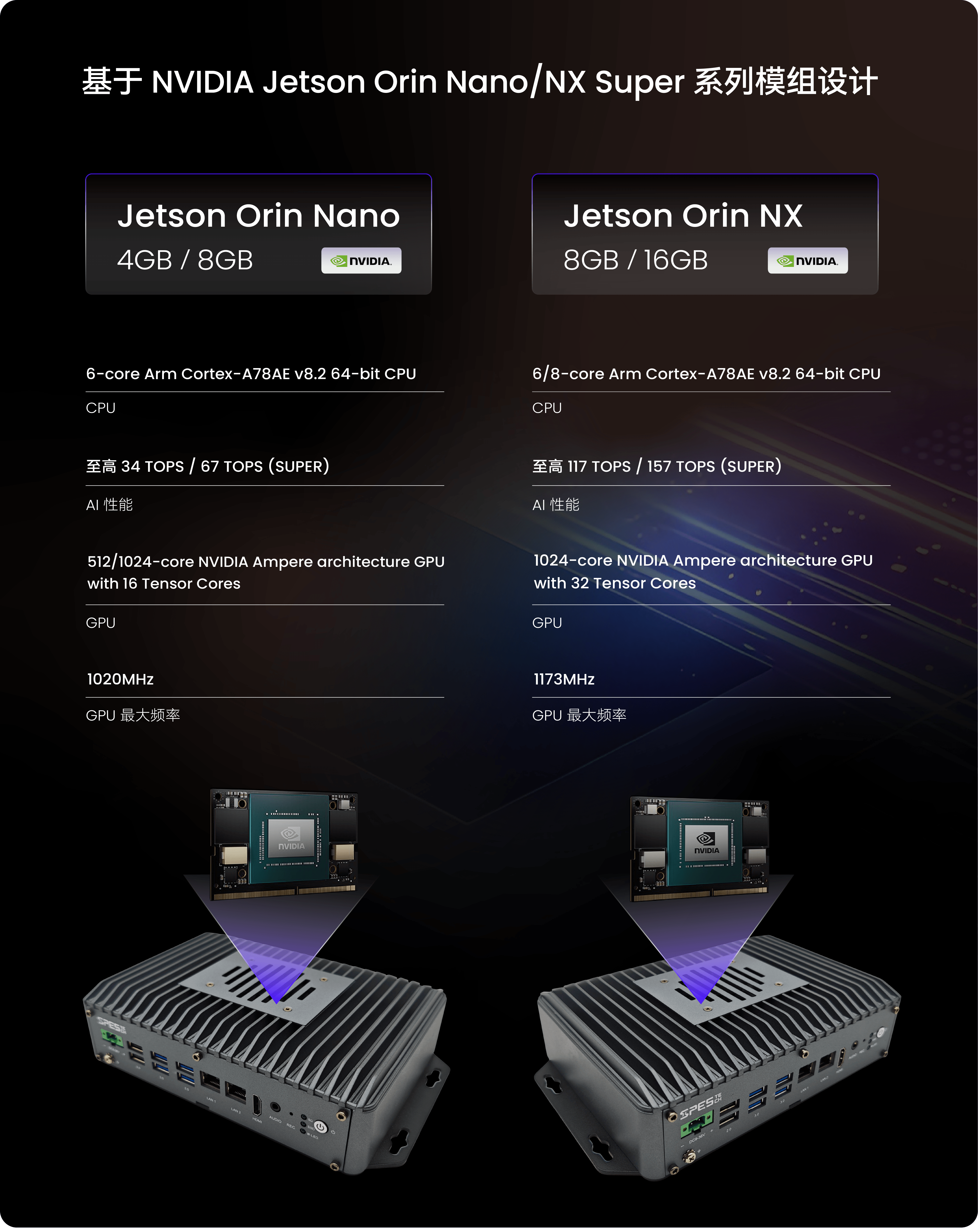 Orin NX 8GB/16GB 四种模组版本,支持标准模式与 Super 模式切换,兼顾能效与性能需求。模组配备了基于 Ampere 架构的 GPU,具有数千个 CUDA 核心和张量核心,升级后整机均有不同程度的性能增益。