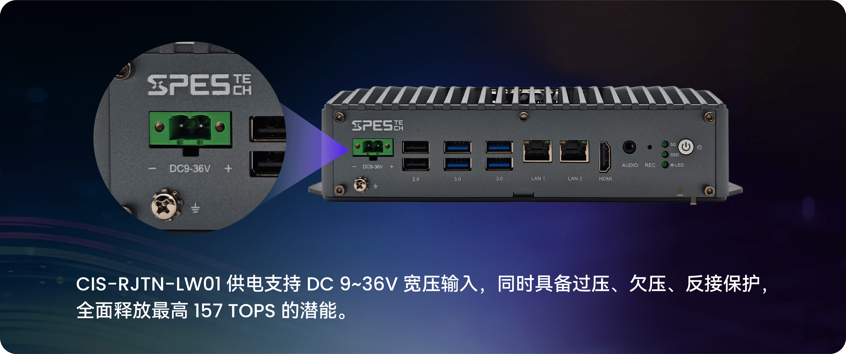 内外部宽压供电:电源效率往往嵌入式方案的关键考虑因素,CIS-RJTN-LW01 整机解锁 Super 模式下功耗需求比标准版提升了近一倍,对供电有更高的要求,CIS-RJTN-LW01 内部模组供电支持 5-20V 宽压,外部供电支持 DC 9~36V 宽压输入,同时具备过压、欠压、反接保护,全面释放最高 157 TOPS 的潜能。
