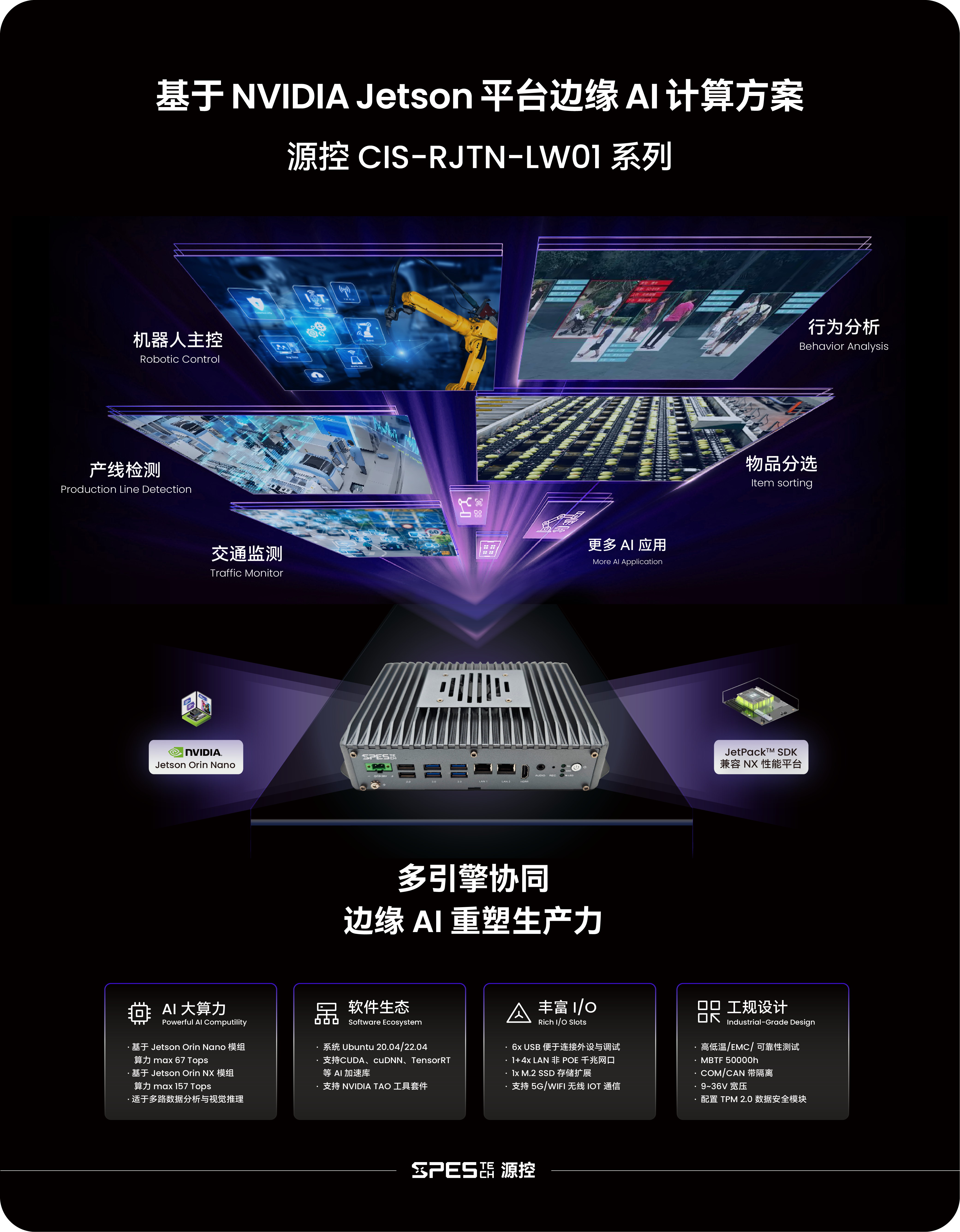 源控推出全新边缘 AI 计算方案 CIS-RJTN-LW01 系列,基于 NVIDIA Jetson Orin Nano/NX Super 系列模组,配备了 Ampere GPU 和 6/8 核 ARM CPU,最高提供 157 TOPS(int8),GPU+NPU+DLA 多引擎协同,为 AI 应用落地提供出色的计算性能,帮助实现智能化升级。