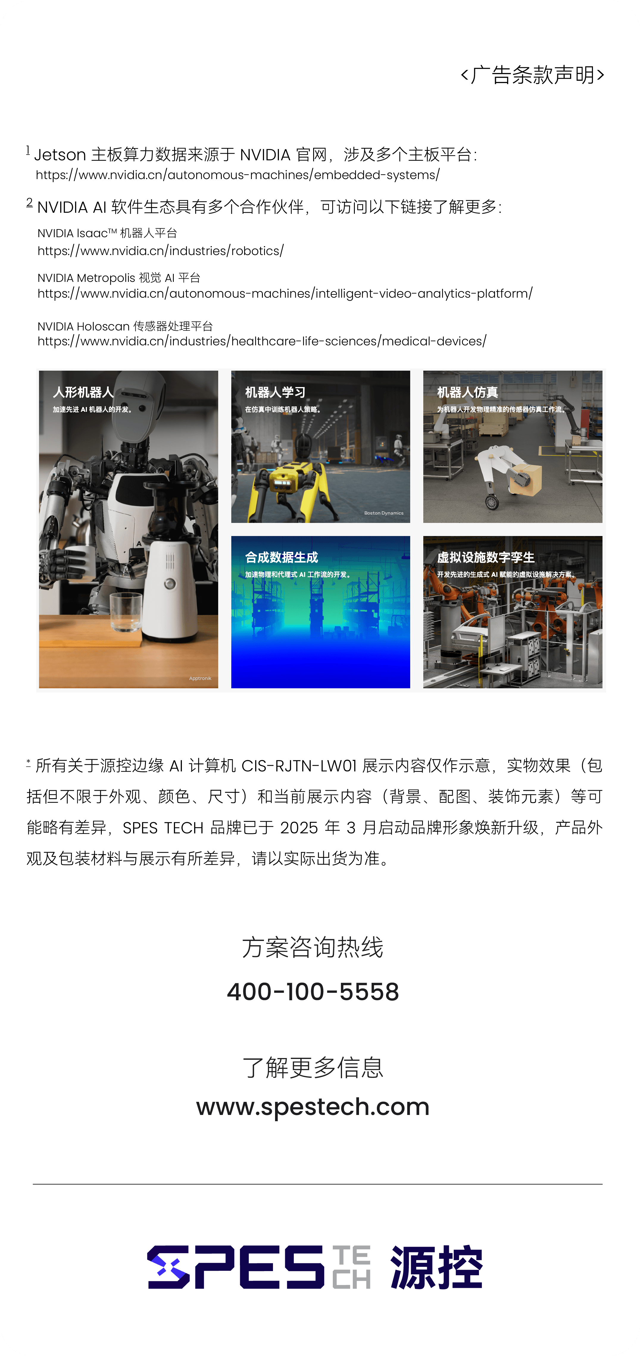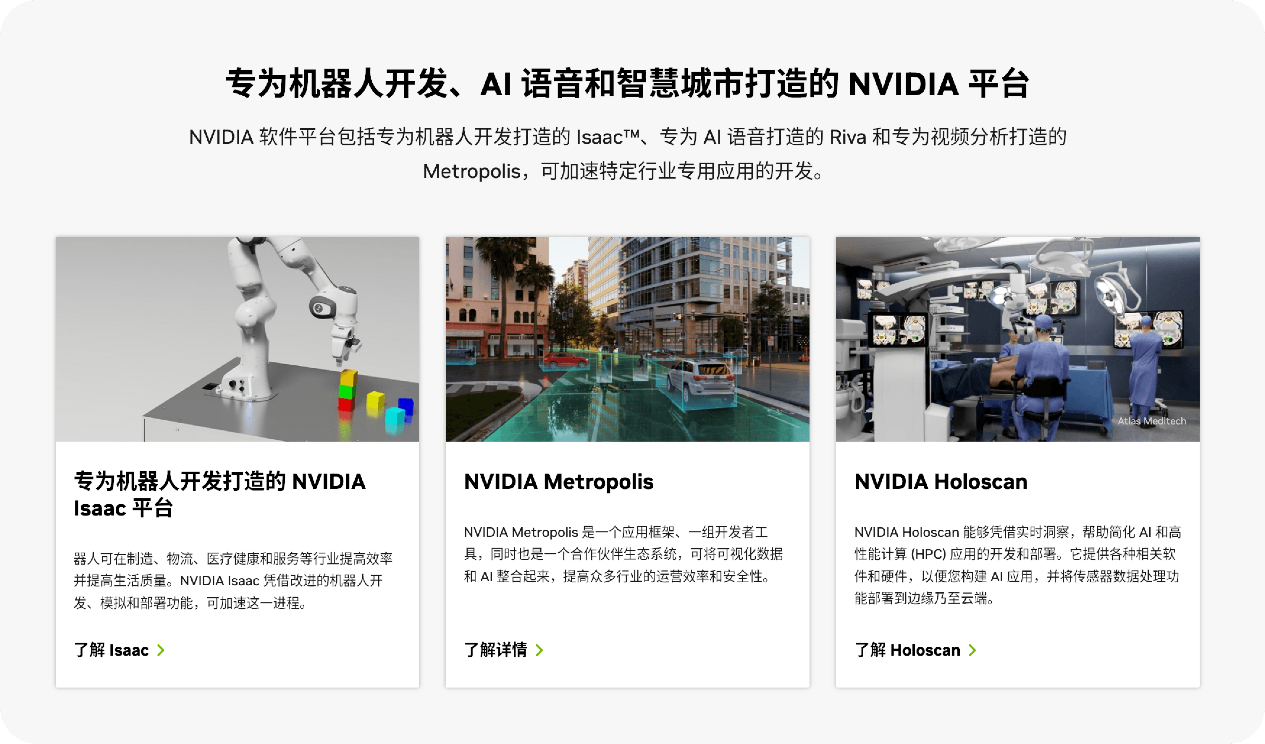 依托于 NVIDIA AI 软件生态2,开发者可以通过 NVIDIA lsaacTM 机器人平台、 NVIDIA Metropolis 视觉 AI 平台、NVIDIA Holoscan 传感器处理平台等进行 AI 模型预训练,可以有效缩短开发时间。