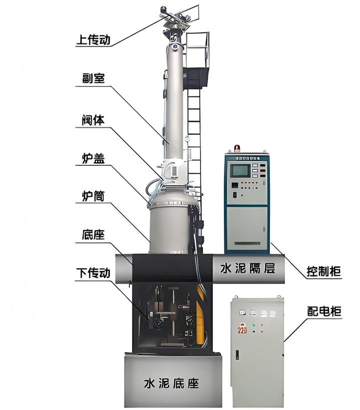 将多晶硅原料放入单晶炉,加热融化,逐步分别进行缩颈生长、放肩生长、等径生长和尾部生长,然后开炉取料,进行晶体测试,最后进行包装、入库,再发货。 单晶硅生长炉是一种高效率制备硅单晶体的设备,基本结构(如图所示)由以下九部分构成: 上炉室、下炉室、炉盖、隔离阀室、观察窗、晶体提升旋转机构、坩埚提升旋转机构、控制柜和基座。