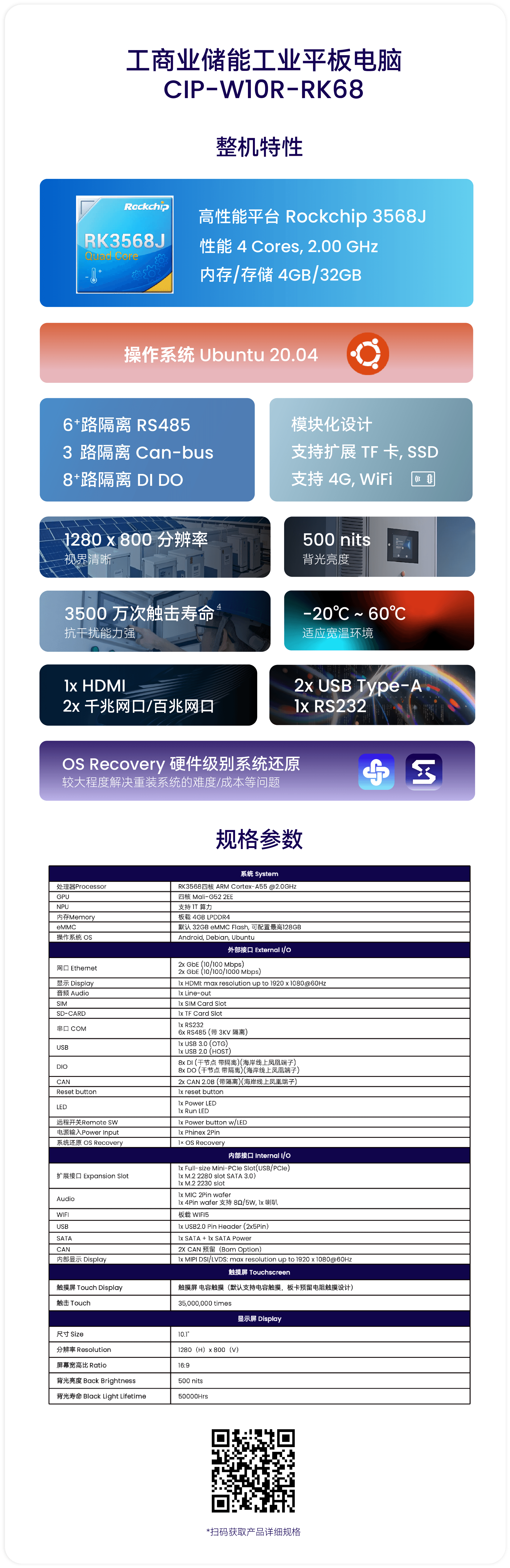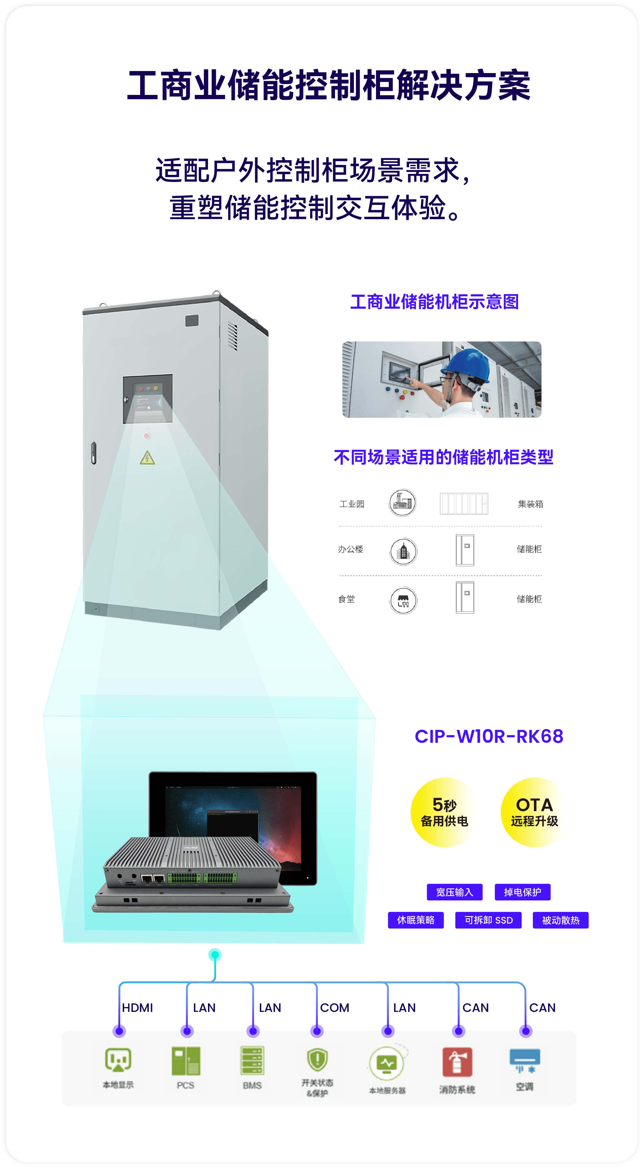 工商业储能系统包含 EMS 系统、PCS、电池簇、消防、温控系统,其中 EMS 系统用于监测、控制和管理储能系统,需要配置工业平板电脑连接多类传感器持续通讯,保障电池组能量调度、状态监测、评估等数据的实时传输,灵敏的触控屏幕,被动散热系统,SPES TECH 源控提供 CIP-W10R-RK68 工业平板电脑作为工商业储能控制柜专用机。