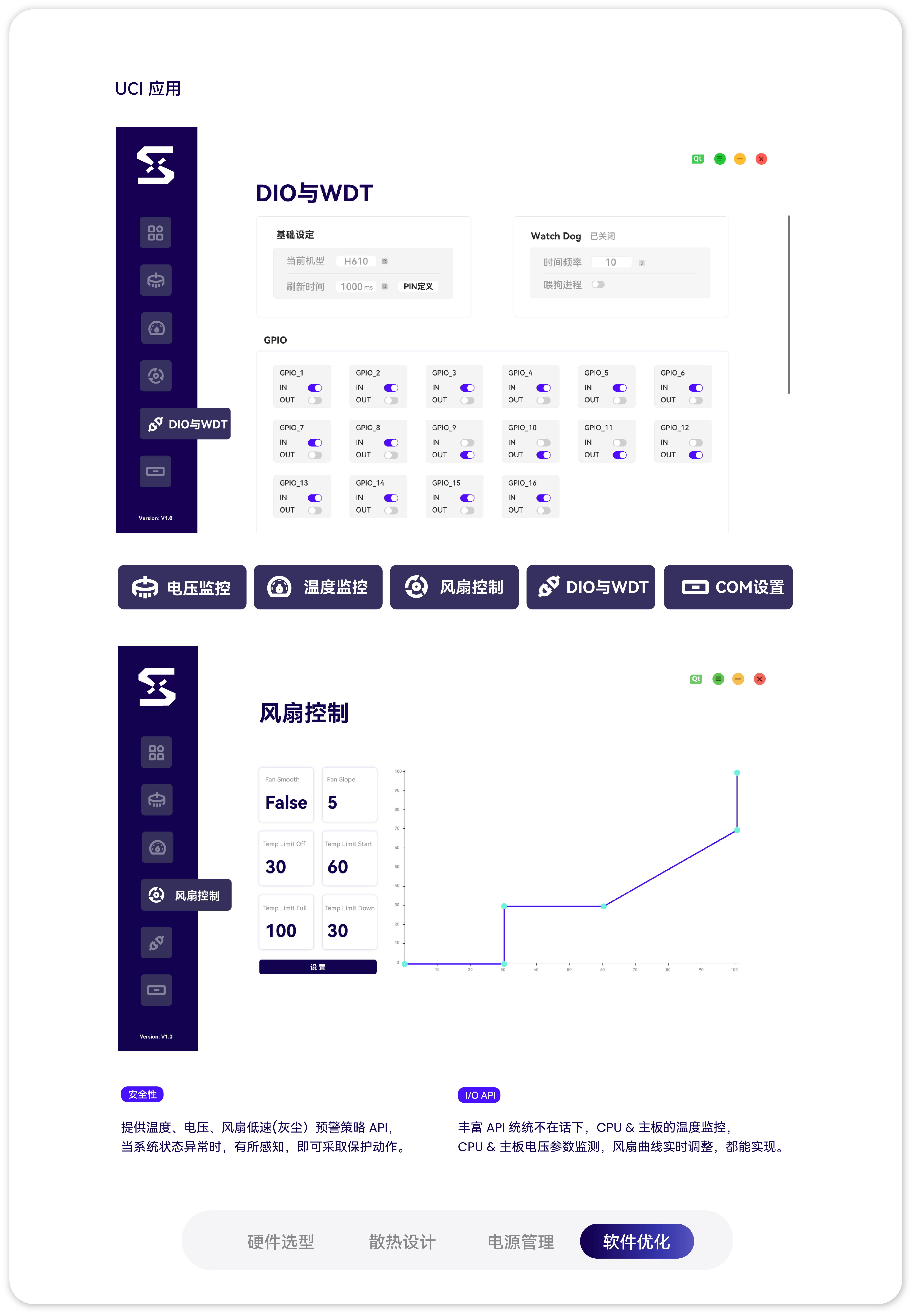 UCI 应用:可降低配置难度、提高部署效率:支持远程监测设备运行状态,实现主机功能客制化配置;支持 IPMI 和 VtT 应用层设置、串口模式(RS232/RS485/RS422)热切换,SmartFan 曲线可在系统下实时调整,满足不同场景需求,提升主板功能易用性。