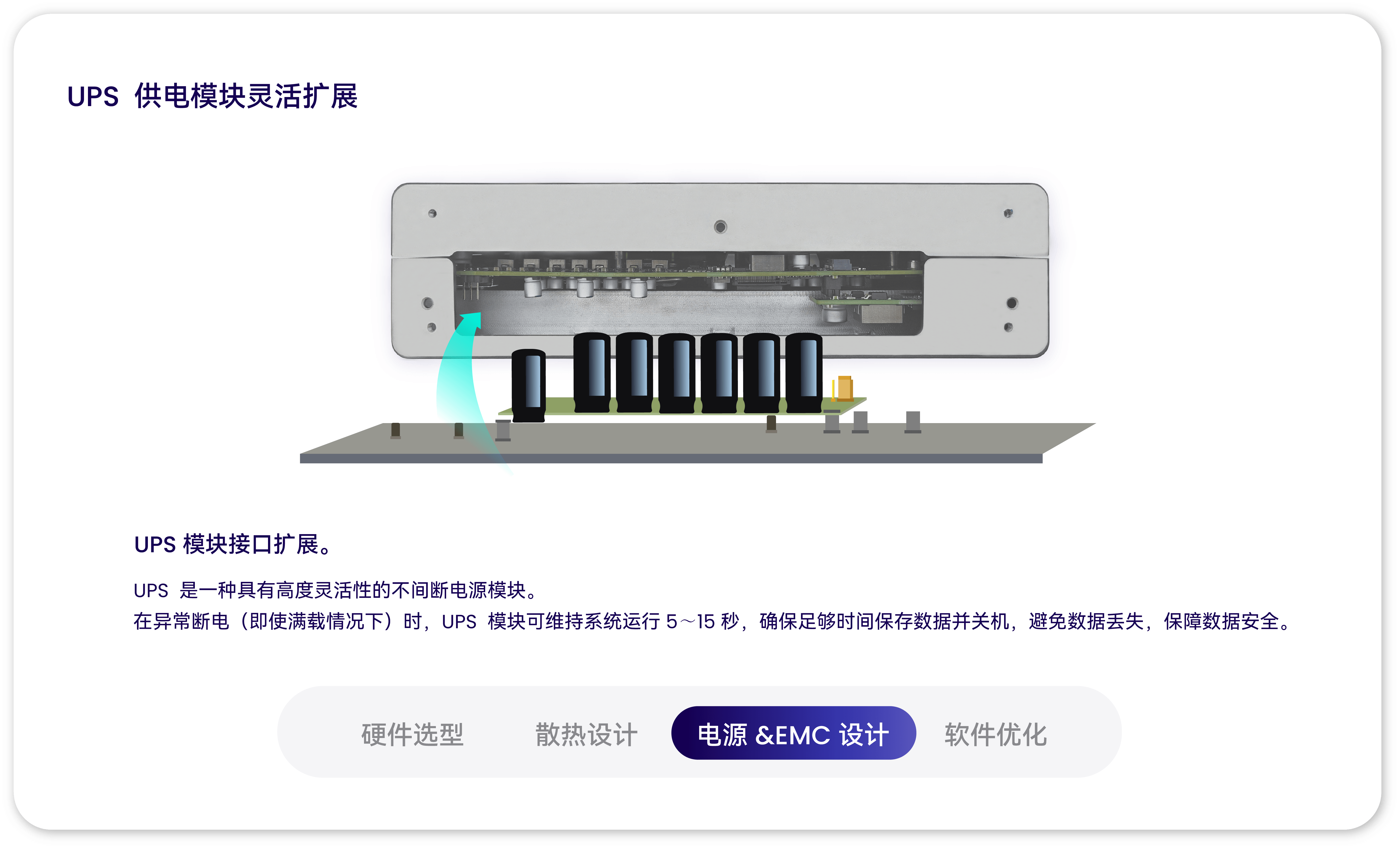 3. 内置 UPS 模块(书本式工业计算机)书本式工业计算机 CIS-HADN-LW01 内置 UPS 模块:异常断电(即使空载)时,可维持系统运行 5~15 秒,确保用户有足够时间保存数据并自动关机,避免数据丢失;出现异常供电情况时,自动切断电源回路,保护核心元器件不受损坏。