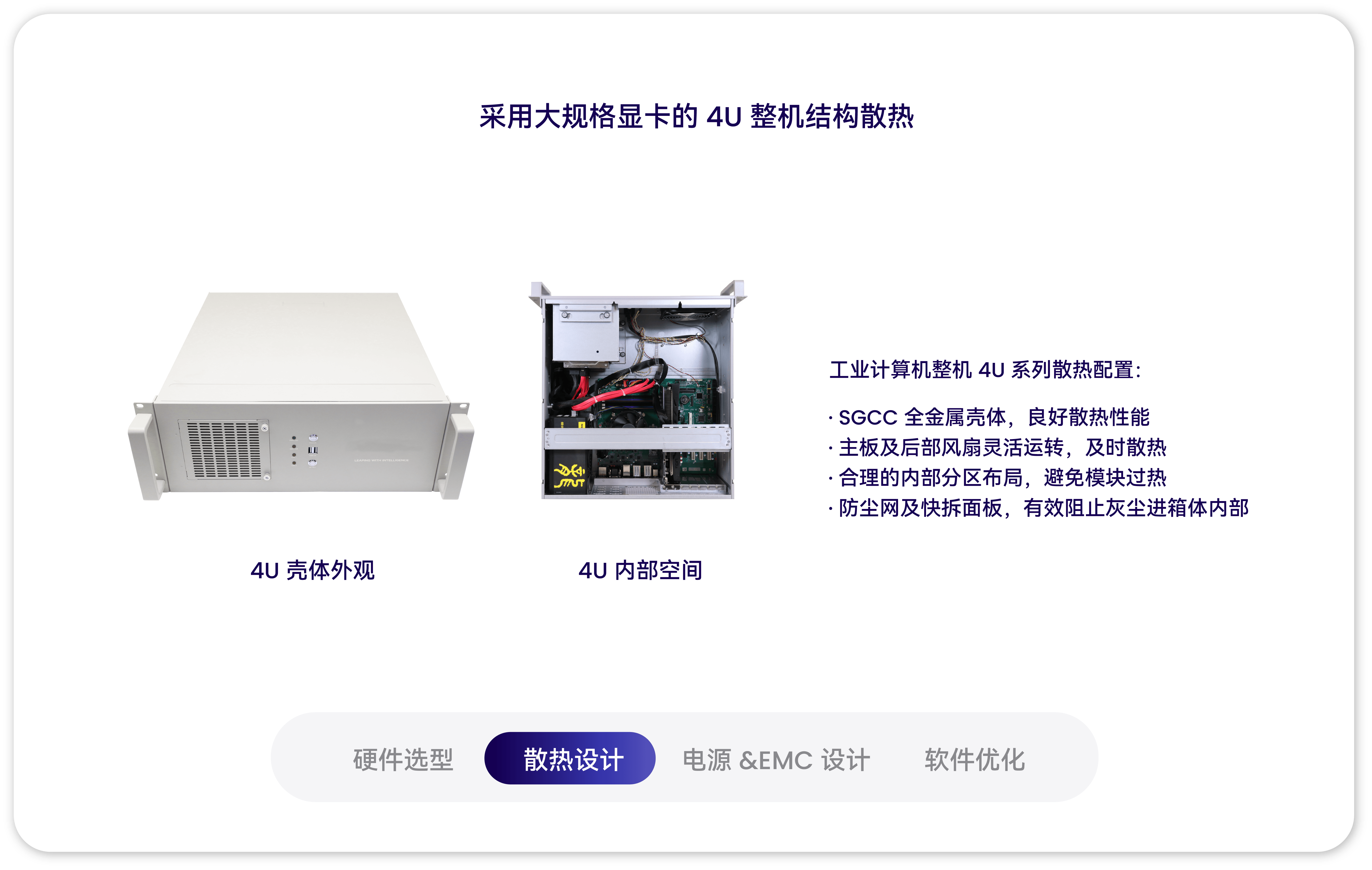 1. 采用大规格显卡的 4U 整机结构散热采用多通道立体散热架构,将 CPU、电源模块等主要发热部件进行分区布局;配置高规格显卡时,可灵活搭配板载高功率风扇,全金属外壳的机箱与高转速的后部风扇,形成 “前进后出” 的定向散热方案,保障 4U 整机内部空间的散热效率稳定。