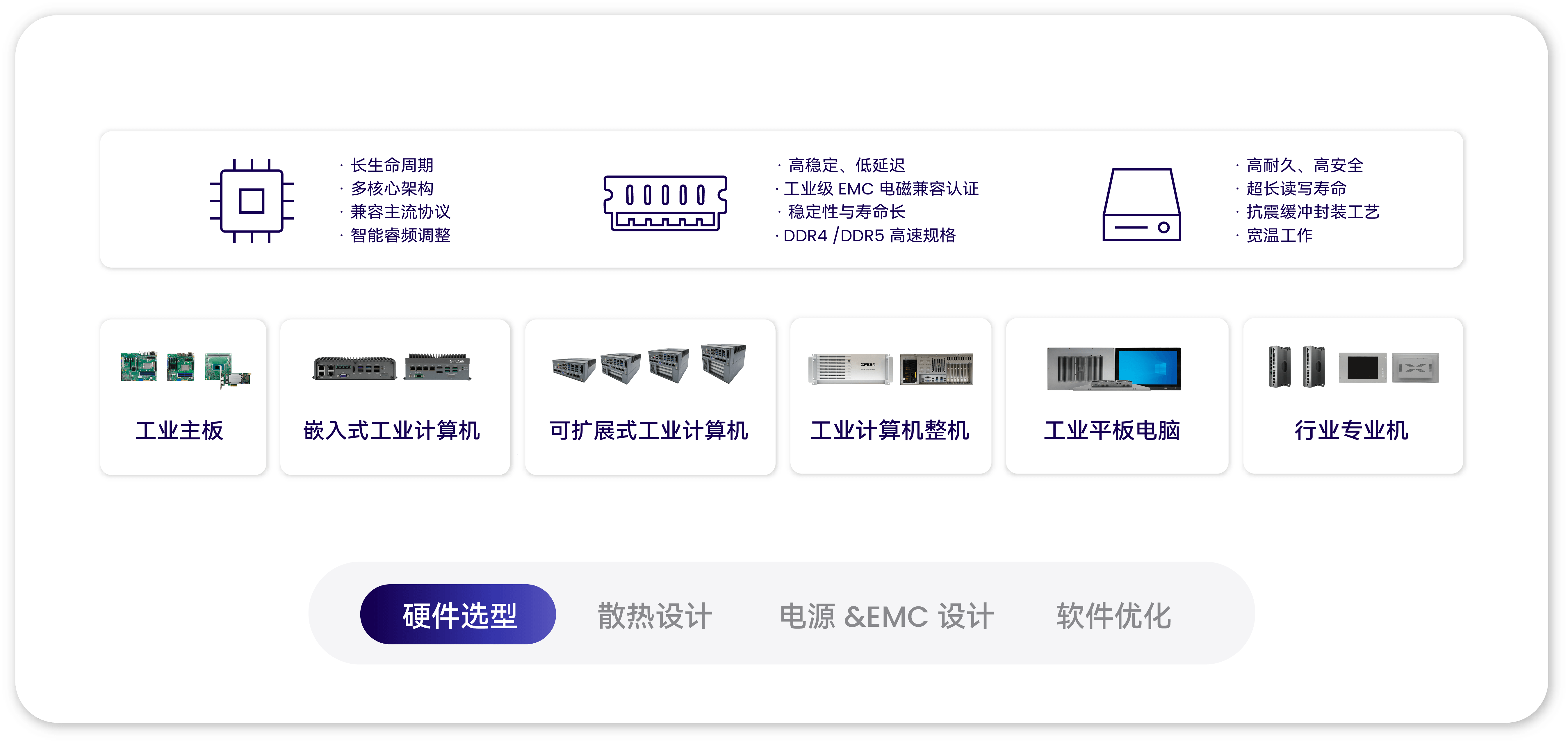 优选工业场景进阶工艺内核处理器,应对制造工艺、多任务处理、通信、睿频等参数,优先选择采用先进制程工艺的处理器;处理器的算力性能需匹配多任务处理的高响应要求,同时对比处理器线程调度能力,实现选用更宽的工作温度范围,适配制造场景极端的环境需求。