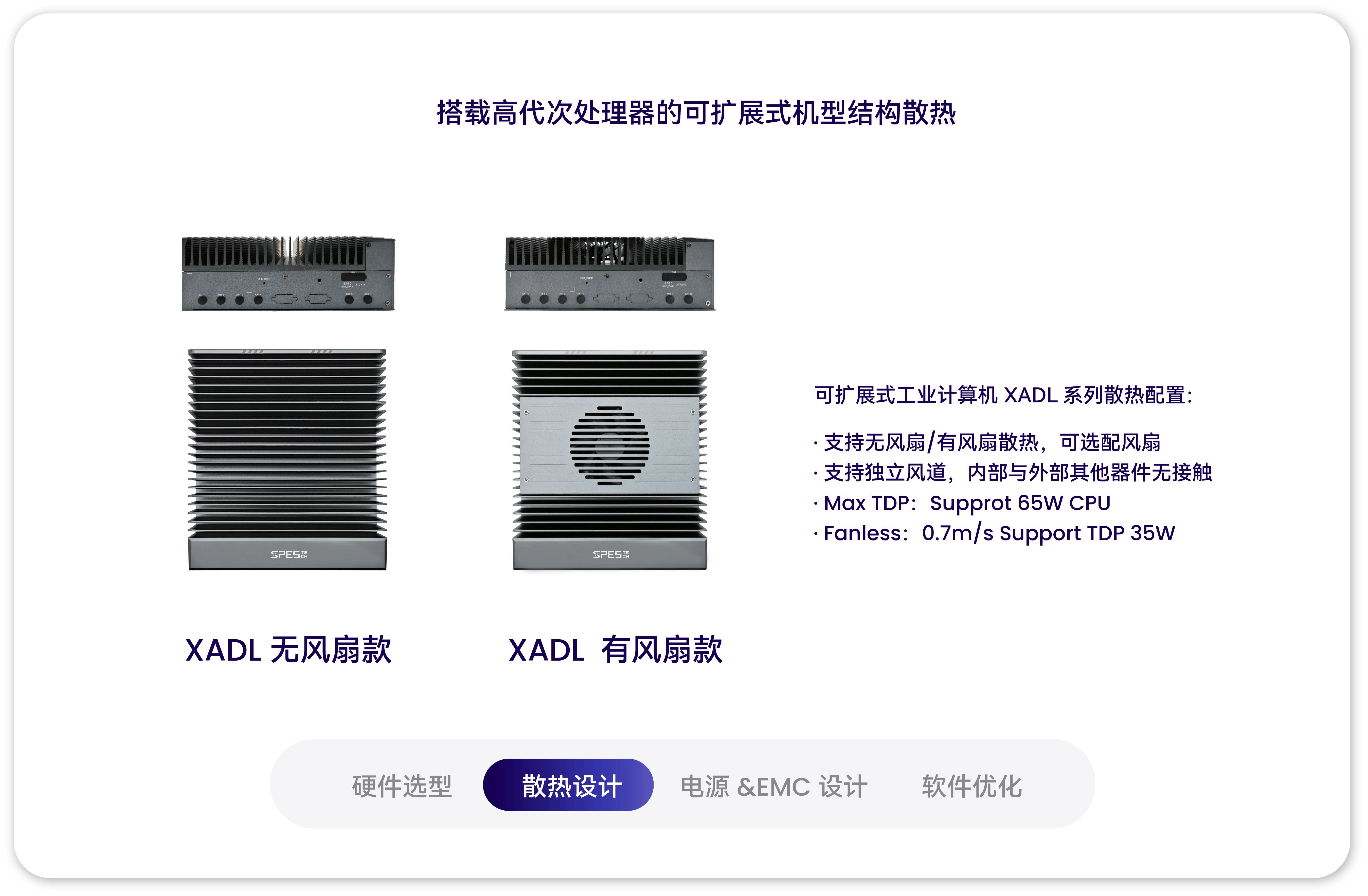 2. 搭载高代次处理器的可扩展式机型结构散热在无风扇需求的特殊场景,研发 “鳍片散热方案”:通过一体化铝合金外壳作为散热载体,当功率参数在 35W 时,鳍片设计可满足散热需求;利用热传导原理,在无机械运转的情况下实现持续散热。若搭载英特尔酷睿 12th / 13th / 14th 的高代次处理器,运行功率可达 65W;若环境影响散热效果,可选择 5 万小时寿命的风扇加强散热,杜绝风扇故障带来的稳定隐患。