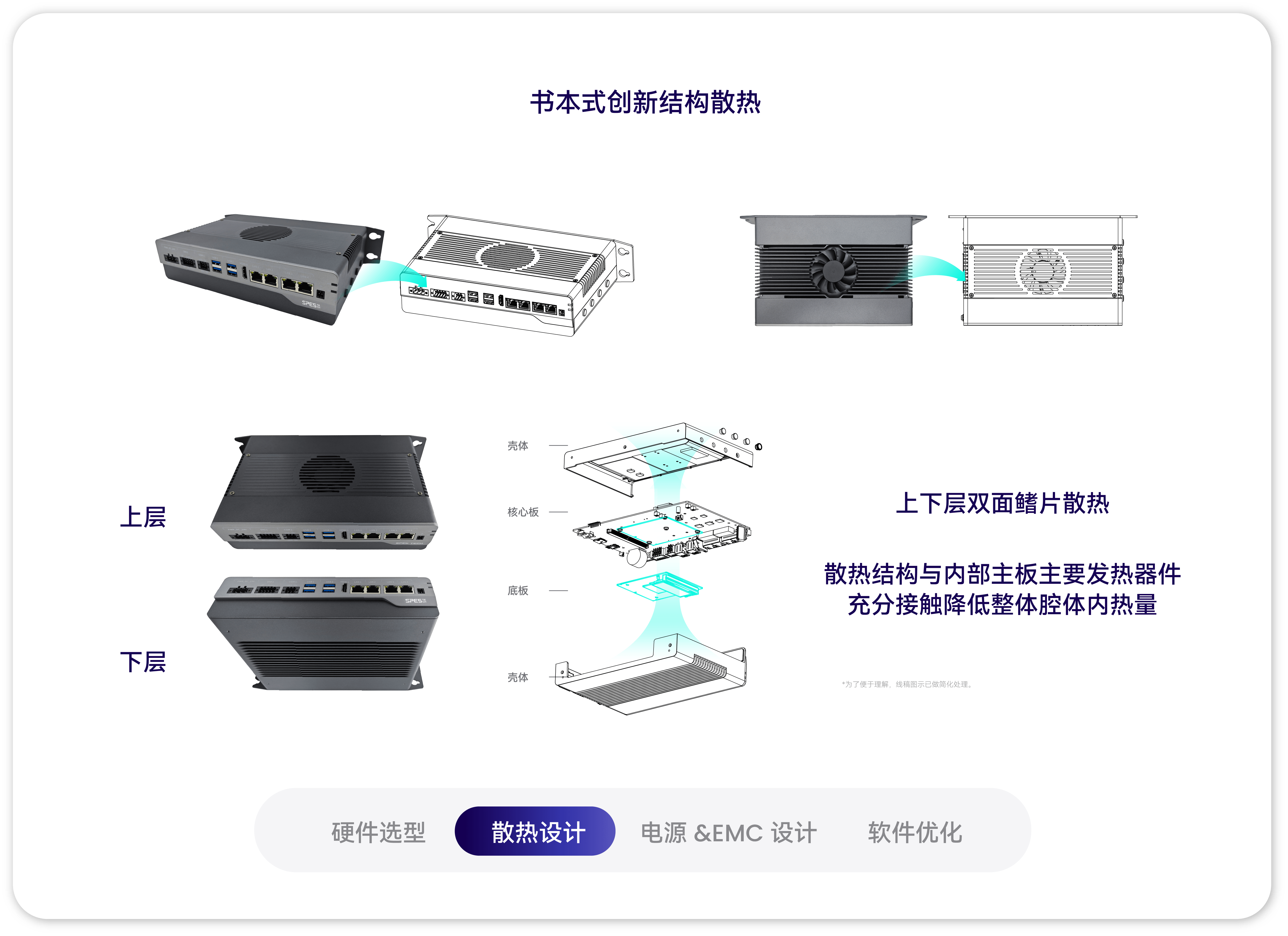3. 书本式创新结构散热在今年发布的书本式工业计算机中,源控首次采用上下双层双面鳍片散热:散热结构与内部主板主要发热部件充分接触,降低整体腔体内热容量;高性能款使用风扇的独立隔离风道设计,满足高瓦数 CPU 功能需求,同时提高防尘等级,SSD 同步散热,保证整机稳定性;可进一步增强铝件散热能力,使整机热量快速下降。