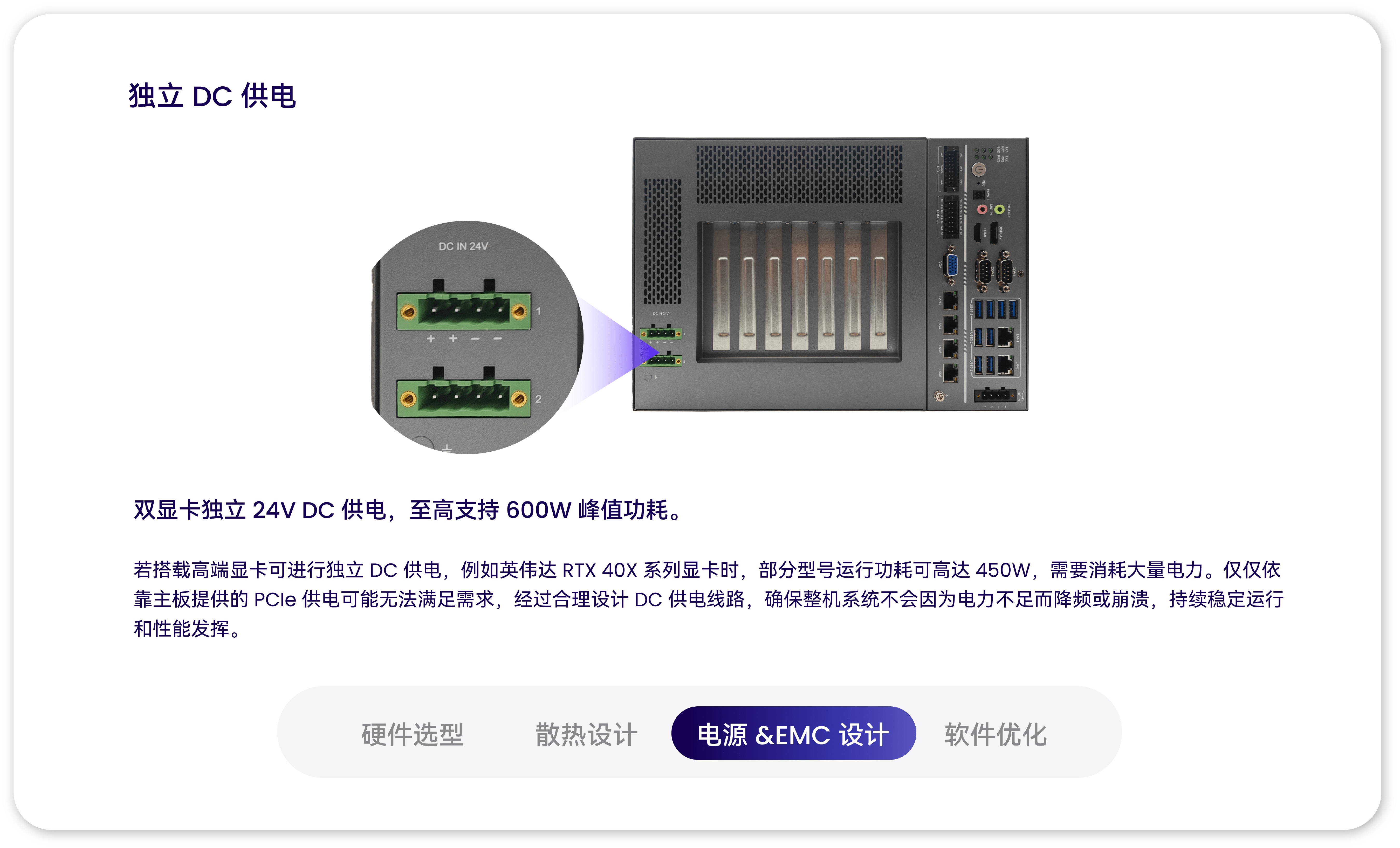 2. 搭载高性能显卡可独立 DC 供电。例如 CIS-XADL-W01-H 搭载英伟达 RTX40 系列显卡时,运行功耗可高达 450W,仅依靠主板 PCIe 供电可能无法满足需求;经过合理设计 DC 供电线路,可确保整机系统稳定运行与性能发挥。