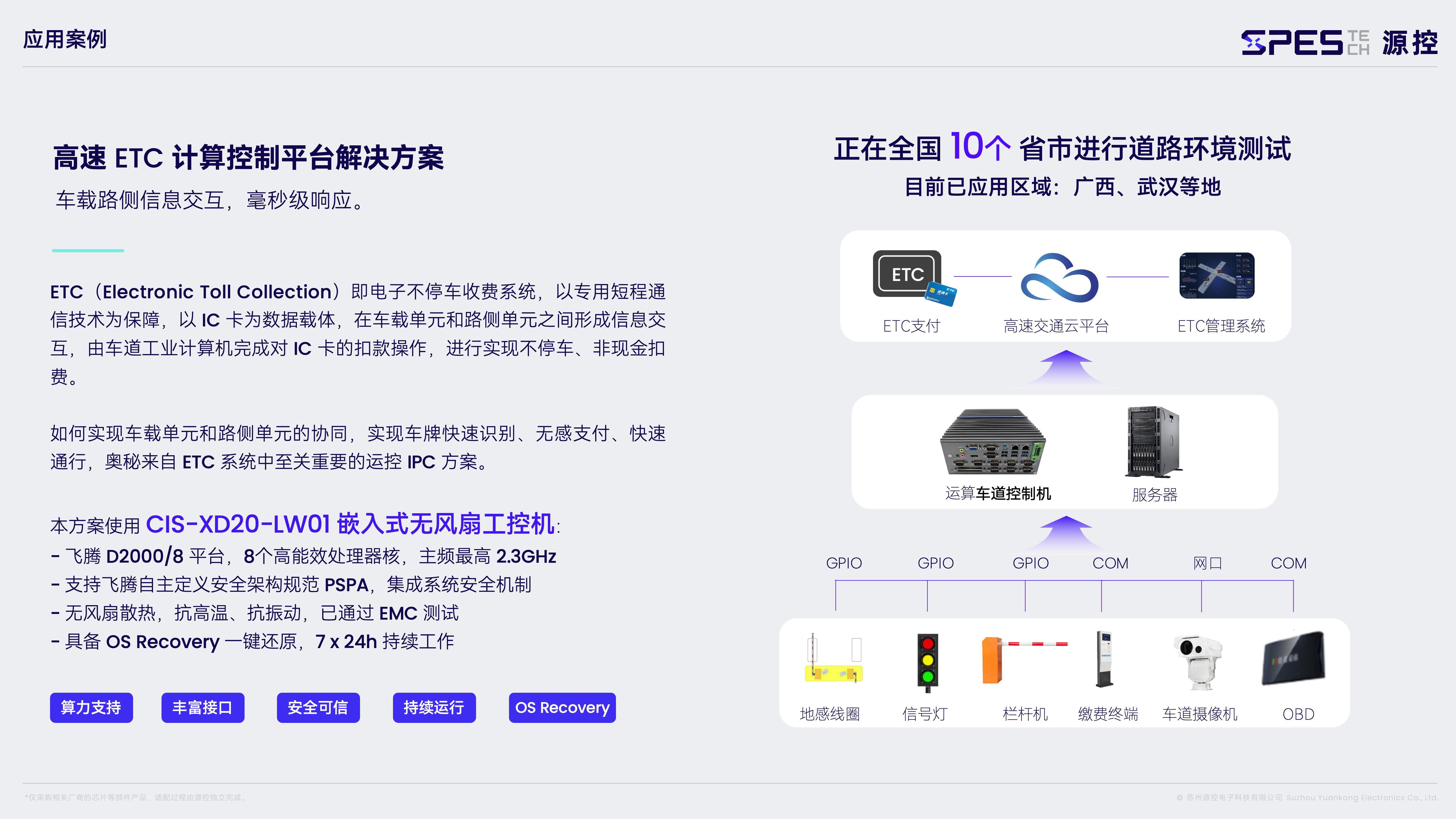 集成自主定义安全架构,支持统信、麒麟等国产化操作系统,多达 10 个串/接口,且带隔离,8x USB、1x 16-bit 可编程 GPIO 接口,充分支持外部多设备连接,包括地感线图、信号灯灯、栏杆机、费额显示器、车道相机等,结合工规级设计,可针对性解决难题,已在武汉等高速 ETC 场景成功落地2,此场景中实际应用在 ETC 系统的发卡场景,便于停车发卡、取卡,与其他设备协作。