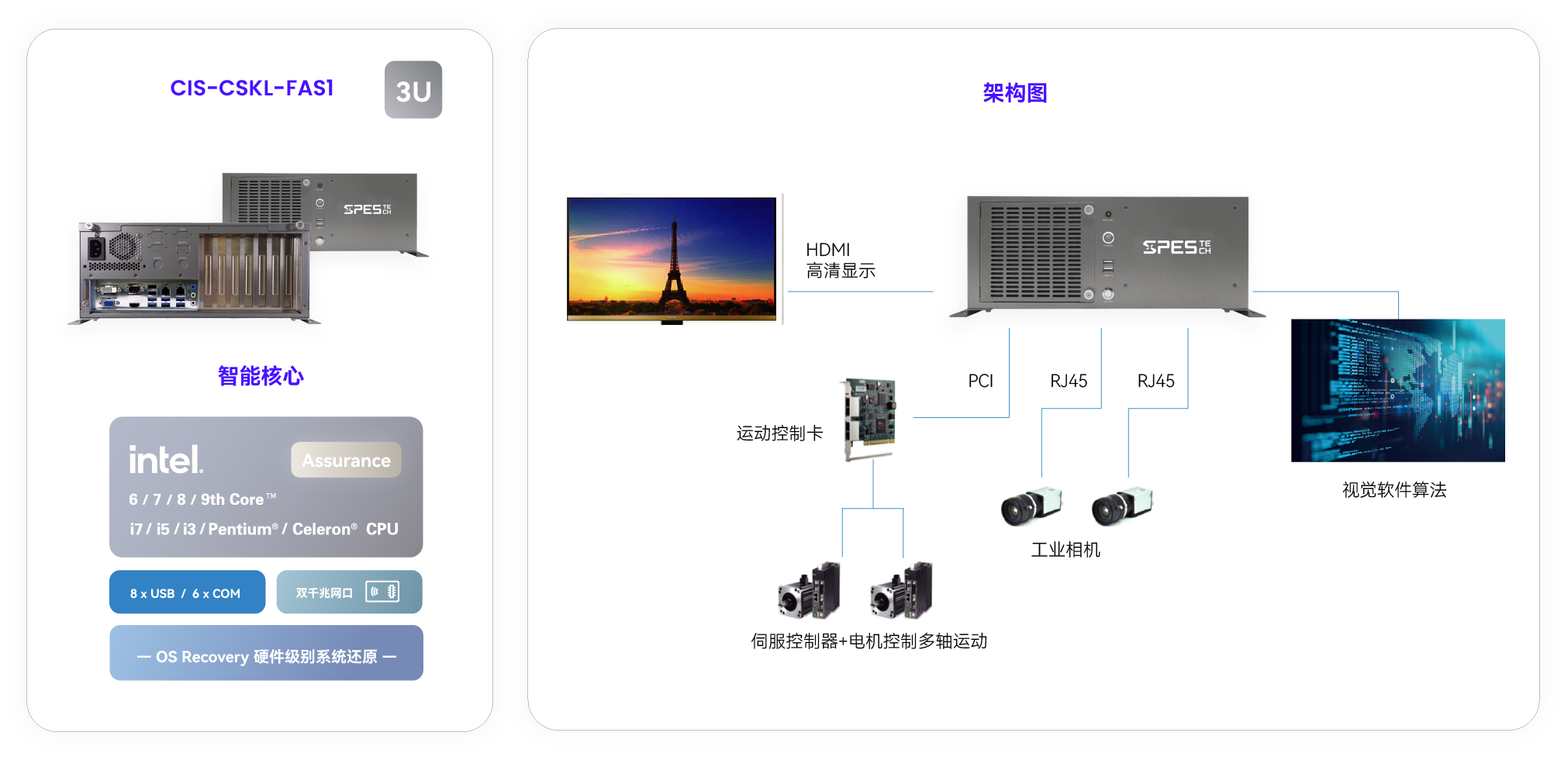 产品同时具备 6x 串口、1x PCIe x16 (Gen3) 、1x PCIe x4 (Gen2)、2x PCI 扩展槽,丰富接口为外接激光控制器、PLC 控制器、高速网卡(用户通过此网卡实现了外接 4 台高速工业检测相机提供了强大助力;此外,产品支持 HDMI、VGA 等高清扩展显示,为工作人员提供了优质监测环境;