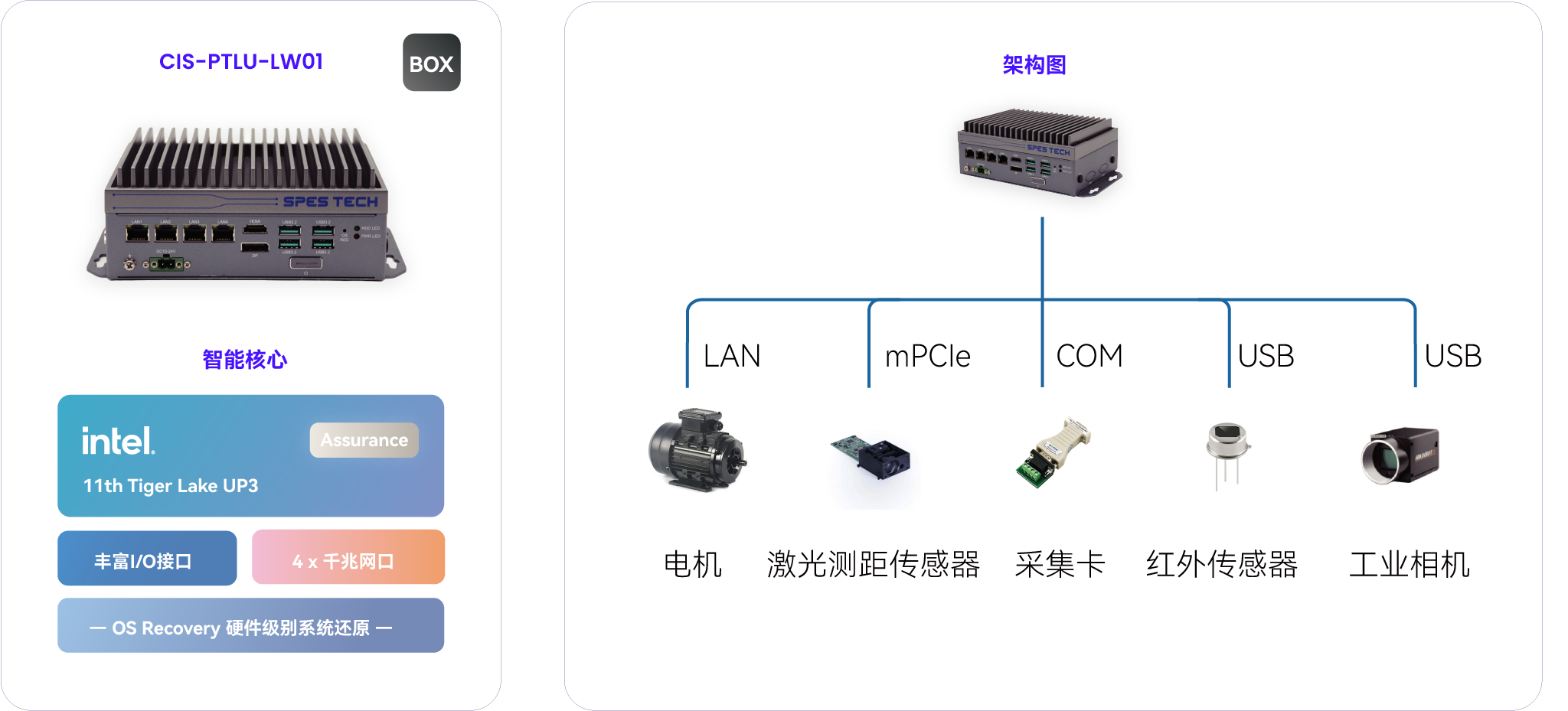 产品搭载 Intel® 第十一代 10nm 制程 Tiger Lake UP3 平台,强大的数据处理能力,为清洁机器人控制系统稳定、快速运行提供强大算力保障;