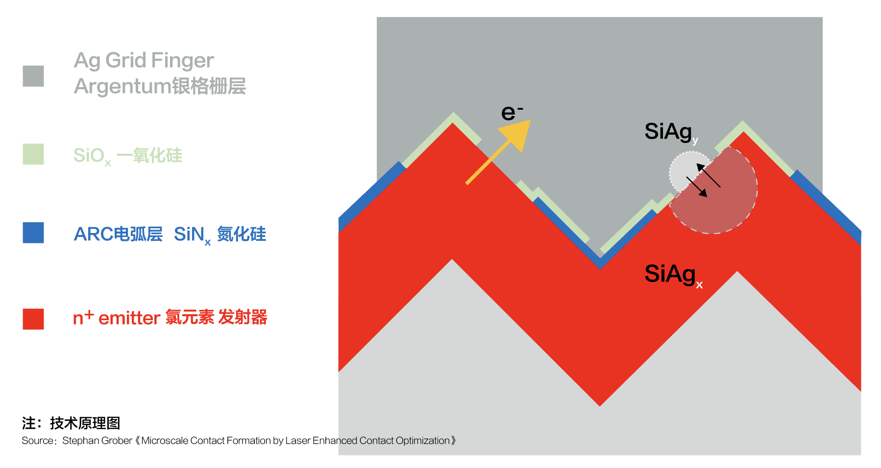 激光辅助烧结技术又名激光增强接触优化(Laser-enhanced contact optimization(LECO),2016年由 Cell Engineering GmbH 申请专利用于修复欠烧结的 PERC 电池,用于改善太阳能电池中金属电极与硅片之间的接触。 在光伏电池的制造过程中,特别是对于 TOPCon(Tunnel Oxide Passivated Contact)太阳能电池,LECO 技术能够精确地破坏硅片表面的钝化层,并在此过程中形成一个优化的金属/硅接触点。据相关数据显示,使用 LECO 技术的 TOPCon 太阳能电池能够提升其转换效率,通常效率提升可以在 0.2% 到 0.5%。