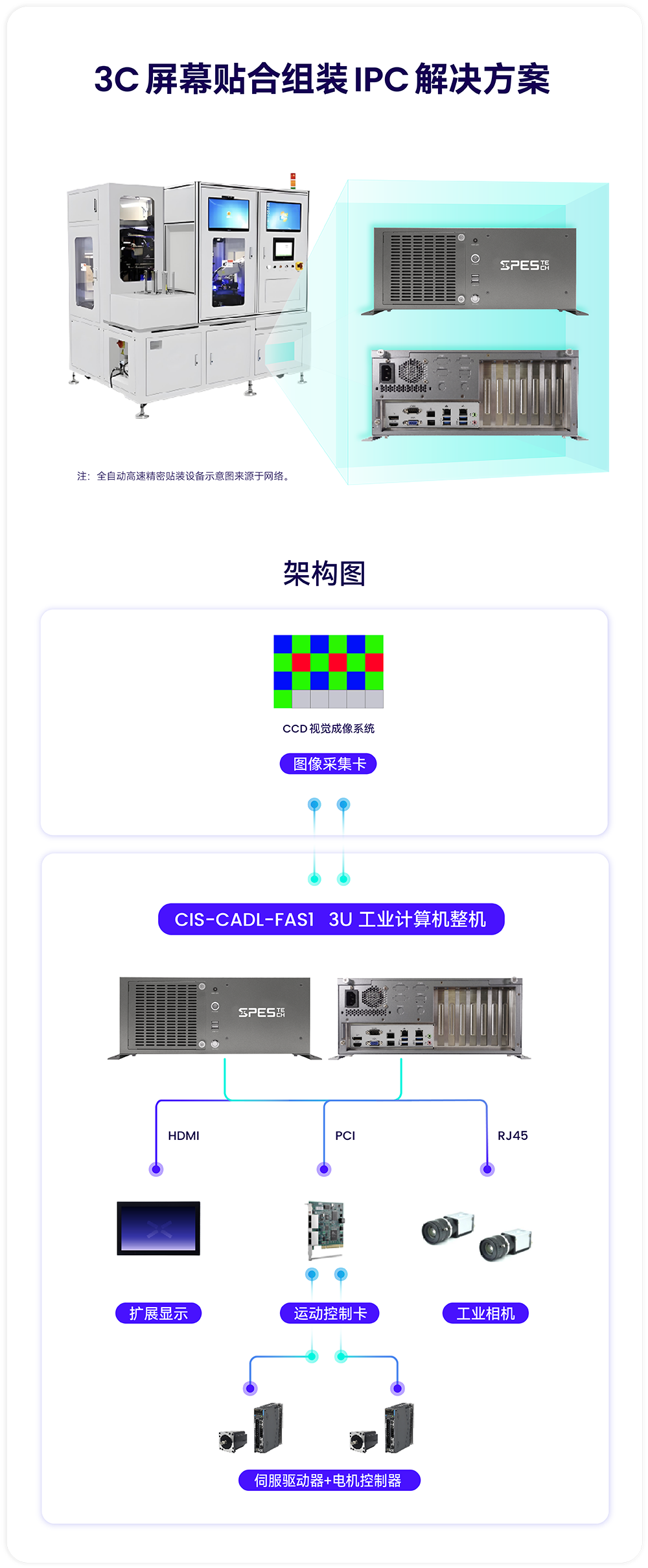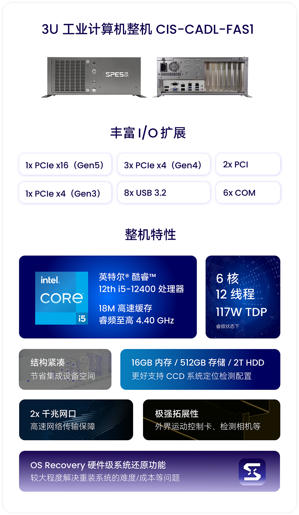 紧凑的空间结构,330x300x135mm(长x宽x高),为整机设备节省了大量空间,为高速上料、高速组屏提供了基础。16GB 内存,512GB 存储,2T HDD 更好地支持 CCD 成像系统定位检测,使得检测速度达到要求水准。集成丰富 I/O 接口,充分支持外部设备链接,包括工业相机、触控板、键鼠、运动控制卡等,通过 2 个千兆网口,3U 整机可连接工业检测相机,完成视频流数据采集传输,为来料定位裁切等视觉检测提供网络保障2。