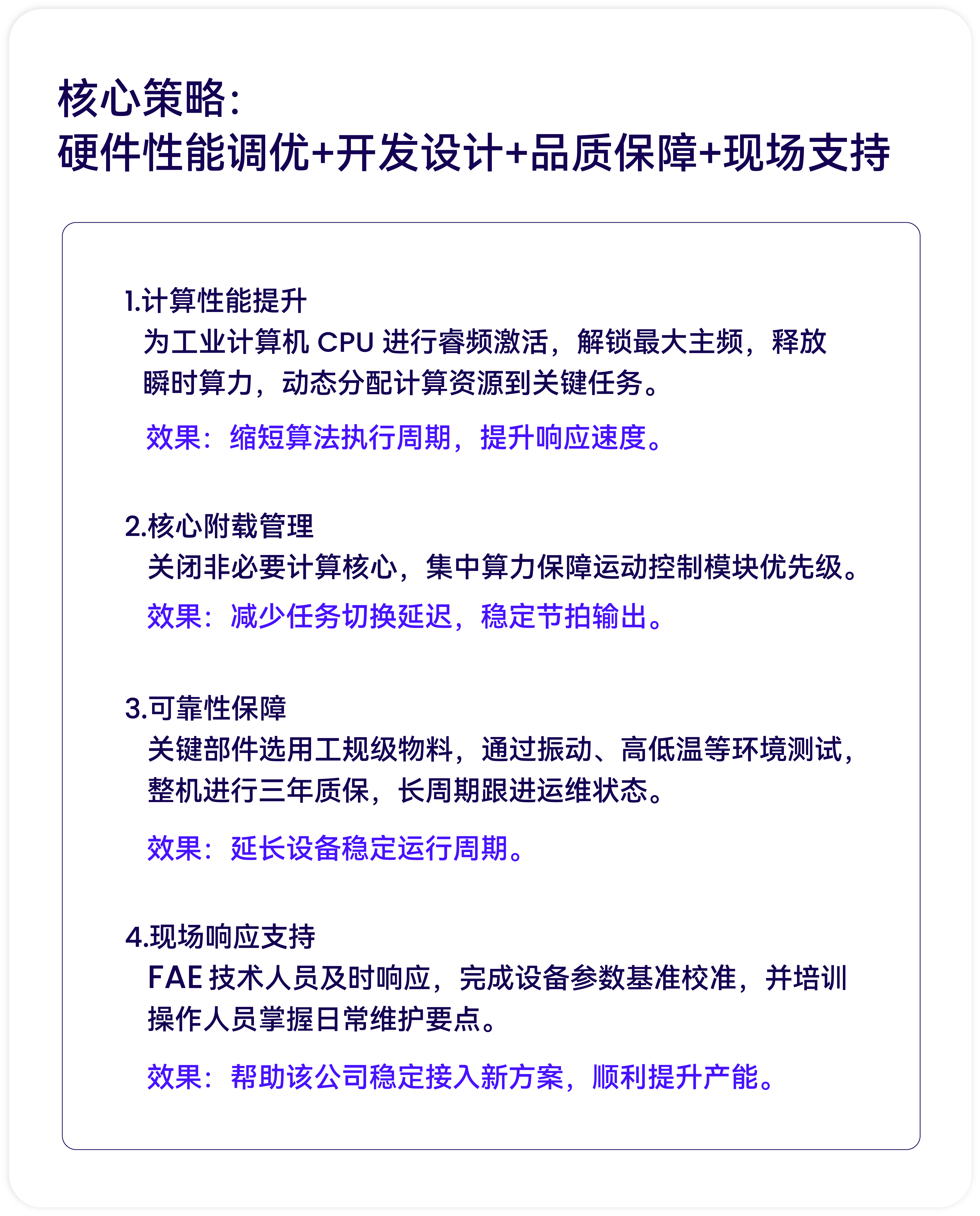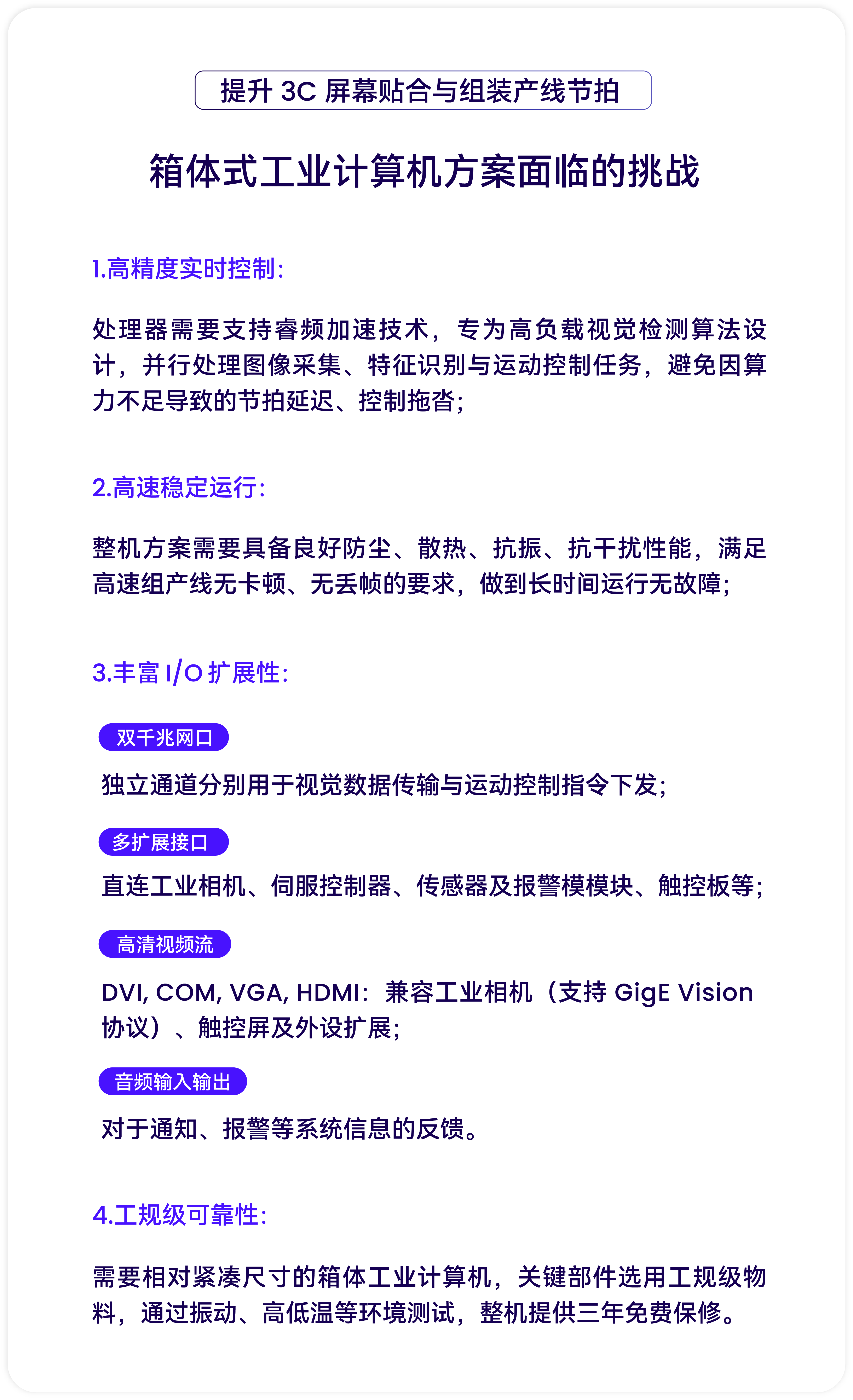 对于 3C 屏幕贴合与组装,该公司面临着生产节拍慢、加工效率低的困难,同时还因为品质事件导致停机,平均每个月达到 2 次,面对日益严苛的品质要求,该公司正在寻找性能强劲、长时间稳定运行、抗电磁干扰且品质稳定的整机式工业计算机,综合 I/O 模块连接需求,并且要提升产线节拍,以满足后续的出货需求:
