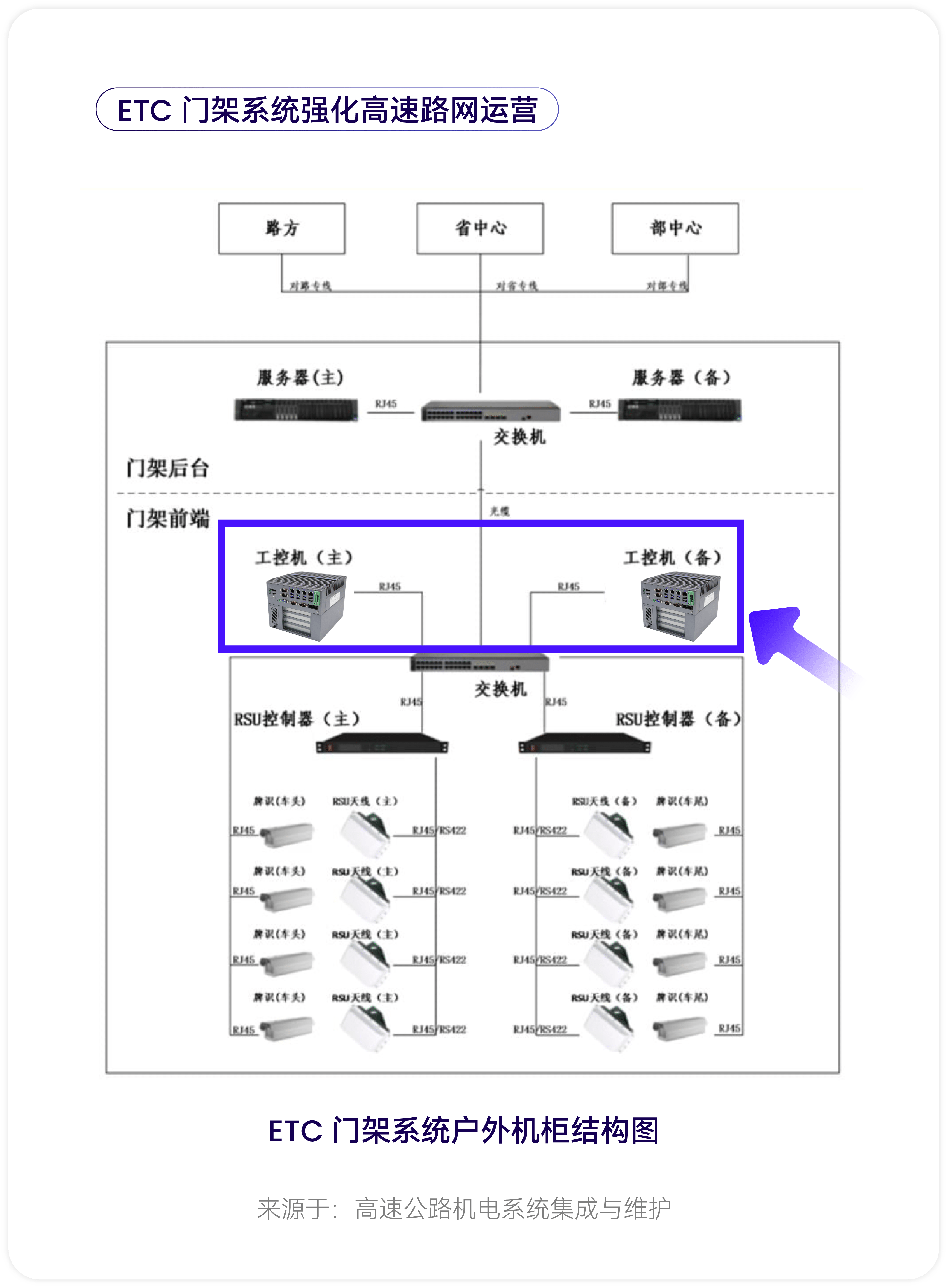 1. 前端系统:数据采集与实时处理核心 前端系统是门架系统的 “感知中枢”,分为机柜内设备与门架上设备,负责车辆信息采集、指令执行与初步数据处理。 机柜内设备:核心包含车道控制器、RSU 控制器、工业交换机、冗余供电设备等,是数据处理与设备协同的核心节点,需 24 小时稳定运行。 门架上设备:涵盖 RSU 天线(负责与 OBU 通信)、车牌图像识别设备、高清摄像机(抓拍车辆信息)、防雷接地设施等,直接暴露于户外复杂环境,需具备强抗干扰、耐候性等特性。 2. 后台系统:数据存储与集中管理 后台系统部署于高速公路收费机房,是门架系统的 “决策中心”,主要由服务器、核心交换机、网络安全设备(防火墙、入侵检测设备等)组成。其核心作用是接收前端系统上传的数据,进行路径还原校验、费率统一管理、交易数据清算,并同步至省级高速交通云平台,实现全国路网数据互联互通。