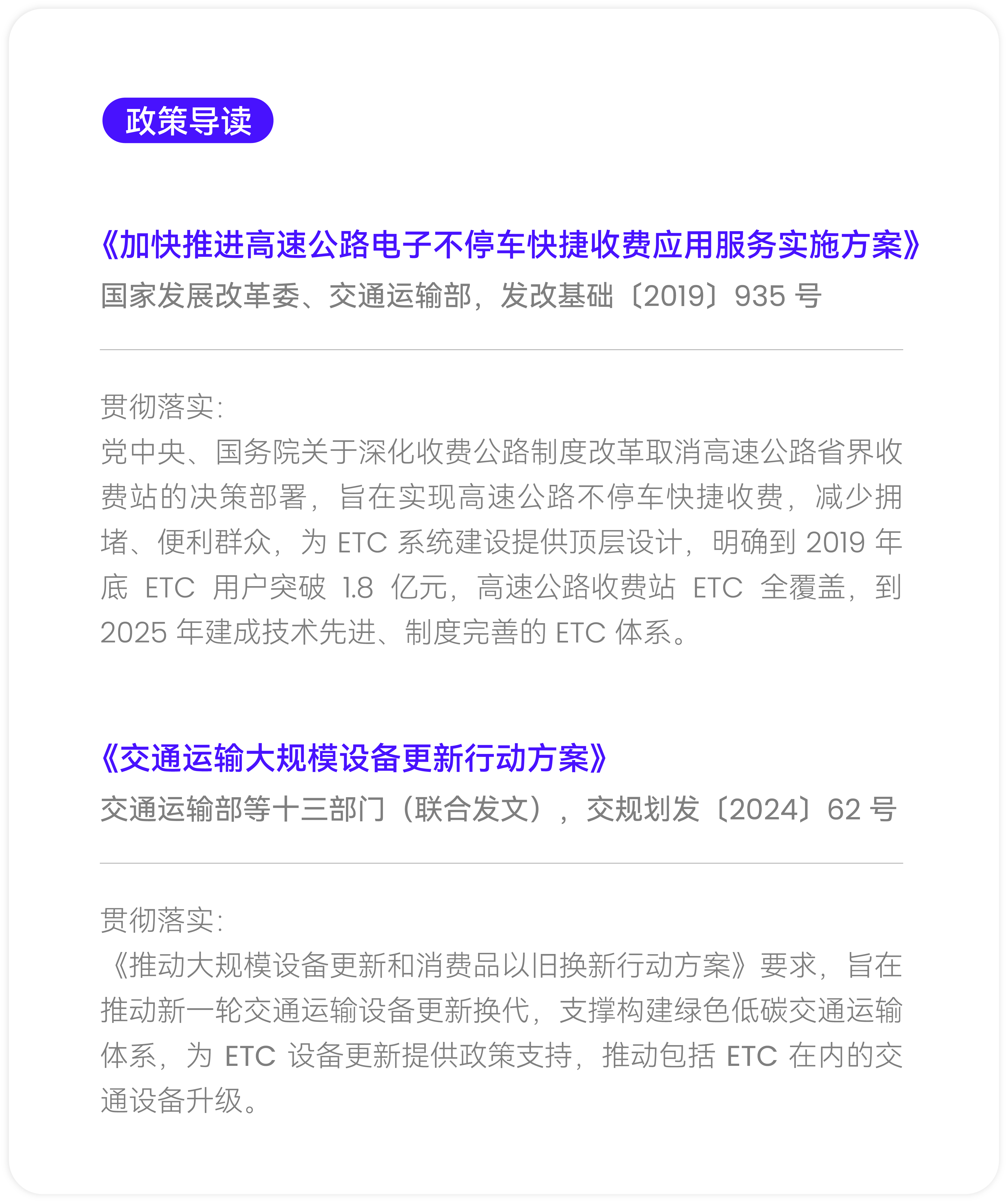 国家发展和改革委员会、交通运输部等部门发布《加快推进高速公路电子不停车快捷收费应用服务实施方案》明确取消高速公路省界收费站,设置 ETC 门架系统,实现对所有车辆分段计费。交通运输部等十三部门联合发文将推动大规模设备更新和消费品以旧换新行动,支撑构建绿色低碳交通运输体系,为 ETC 设备更新提供政策支持,推动包括 ETC 在内的交通设备升级。